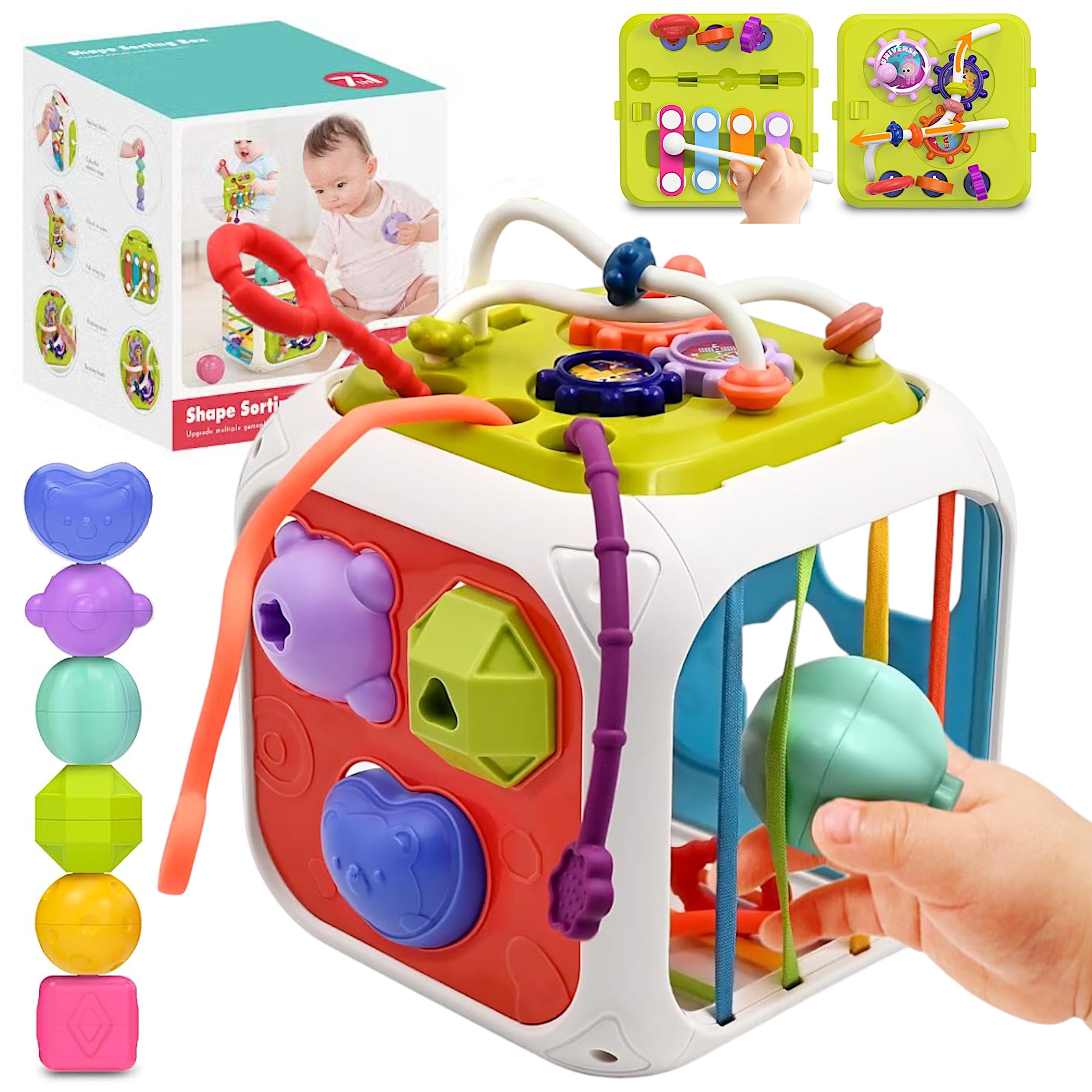 Edukacyjna kostka sensoryczna 8w1 to wszechstronna zabawka, która łączy sorter kształtów, cymbałki, labirynty, gryzaki i inne aktywności, wspierając rozwój motoryki, logicznego myślenia oraz koordynacji ręka-oko. Kompaktowy rozmiar sprawia, że jest idealna do zabawy w domu i w podróży.