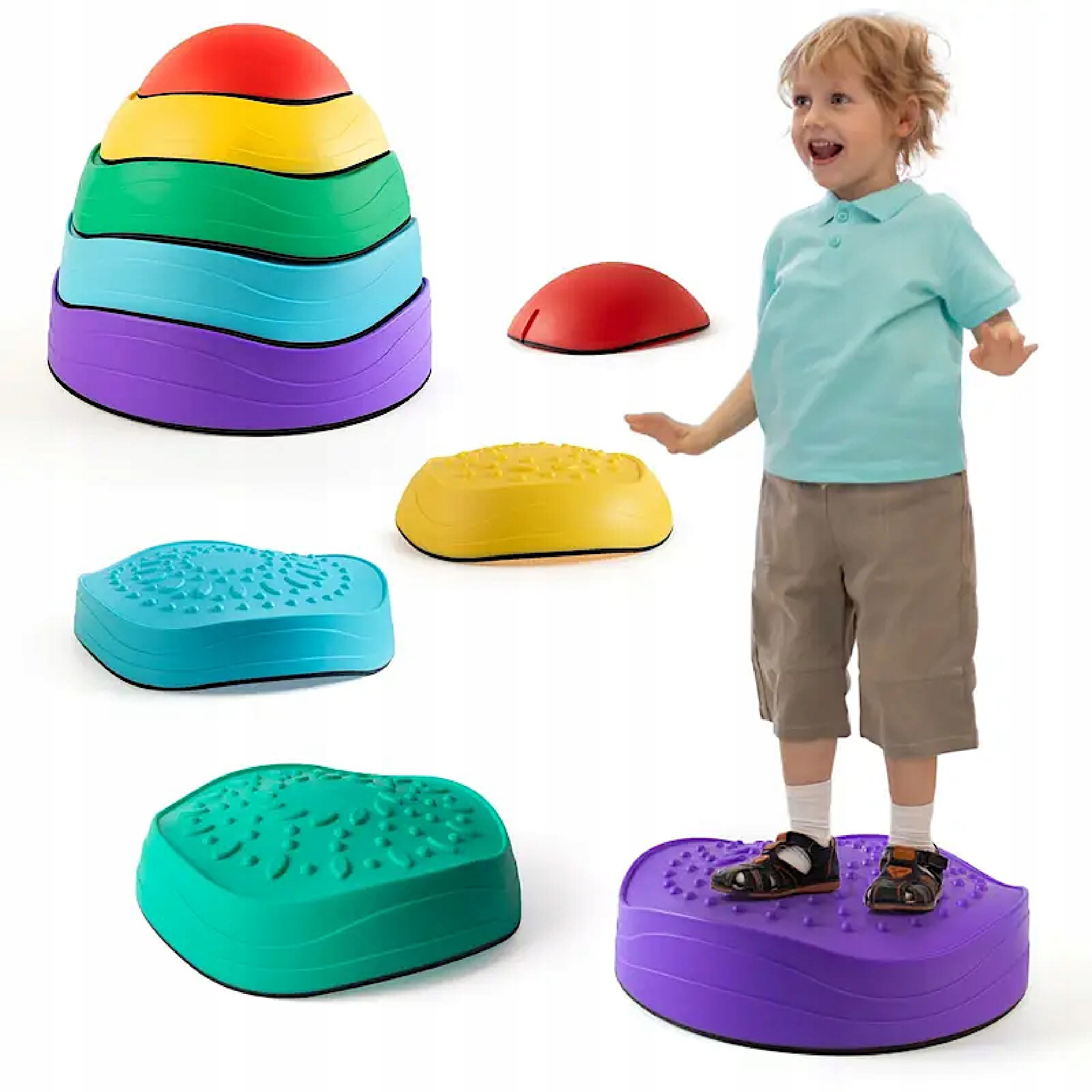 Zestaw 5 kolorowych kamieni sensorycznych to doskonała pomoc edukacyjna, wspierająca rozwój motoryki, równowagi oraz koordynacji wzrokowo-ruchowej. Kamienie wykonane są z wytrzymałych materiałów, które utrzymują ciężar do 100 kg, co pozwala na ich używanie zarówno przez dzieci, jak i dorosłych. Antypoślizgowa powierzchnia zapewnia bezpieczeństwo podczas zabawy, a wodoodporne materiały umożliwiają korzystanie z nich zarówno w pomieszczeniach, jak i na zewnątrz. Dzięki możliwości układania kamieni w stos, zestaw jest łatwy do przechowywania.