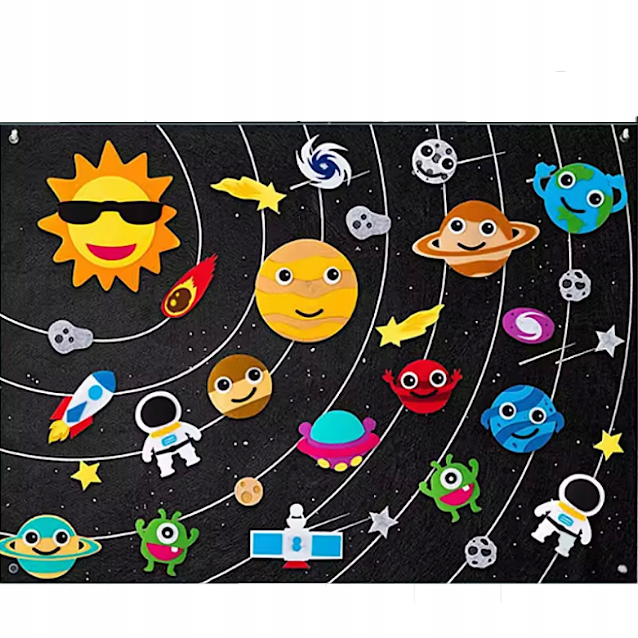 Interaktywna tablica edukacyjna zawiera 30 ruchomych elementów na rzepy, takich jak planety, gwiazdy, rakieta czy astronauta, umożliwiających tworzenie własnych układów słonecznych. Wykonana z wysokiej jakości, bezpiecznego filcu, wspiera rozwój manualny, poznawczy oraz wyobraźnię dziecka. Idealna do nauki w domu, przedszkolu czy szkole.