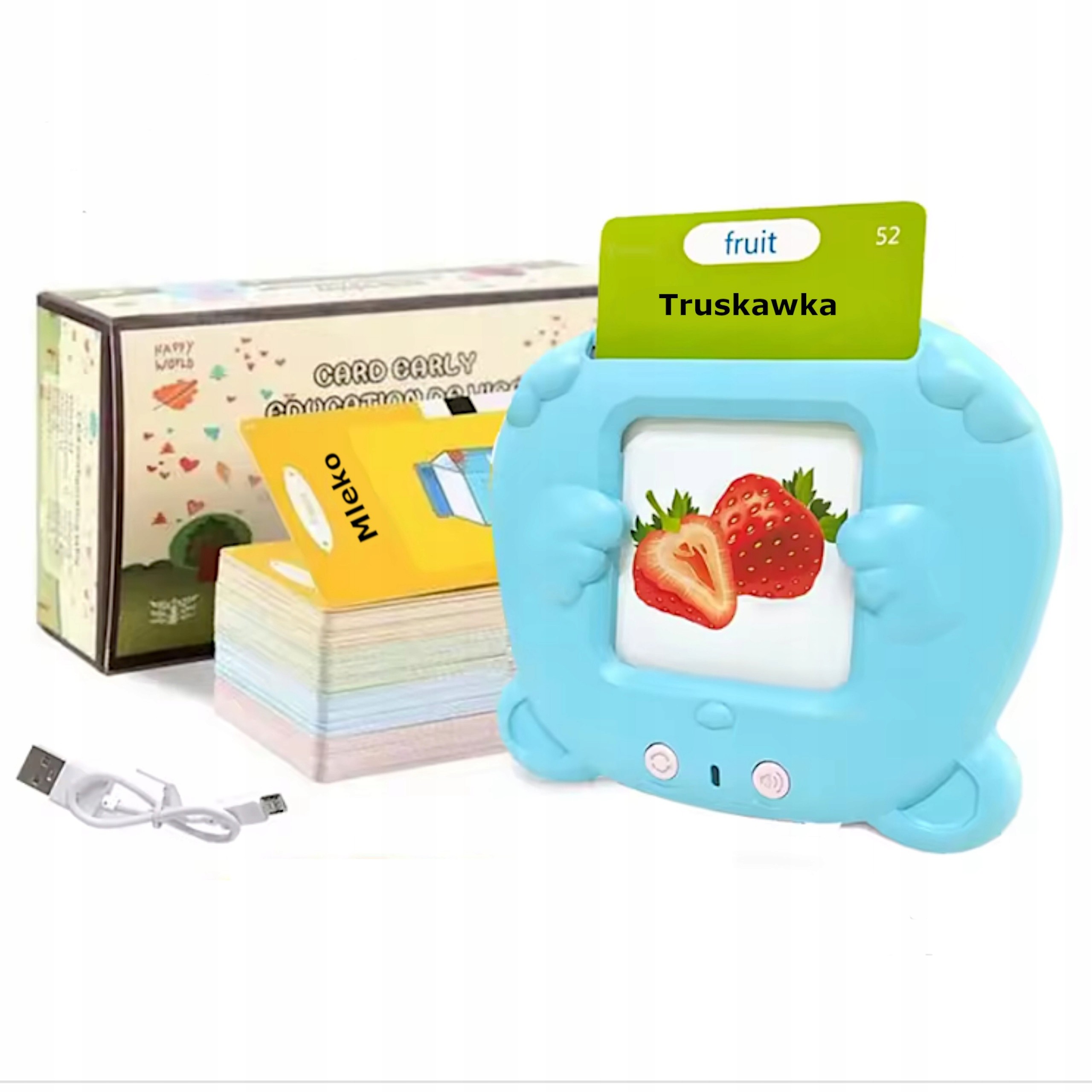 Interaktywny czytnik kart ułatwiający naukę języka angielskiego poprzez zabawę. W zestawie znajduje się 112 dwustronnych kart edukacyjnych (224 słowa) z kategorii takich jak zwierzęta, owoce, pojazdy czy kolory. Dziecko wkłada kartę do czytnika, który odczytuje słowo w języku polskim i angielskim. Zabawka posiada wbudowany głośnik z regulacją głośności, odtwarzanie powtórek oraz zasilanie przez kabel USB. Kompaktowy i lekki design sprawia, że jest idealna do zabrania w podróż.