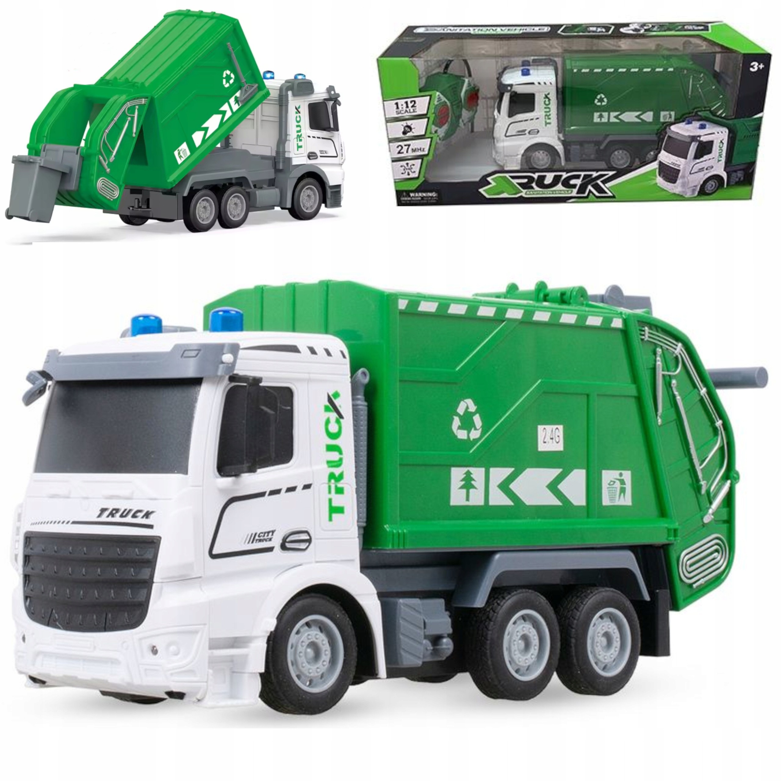 Realistycznie odwzorowany model śmieciarki w skali 1:12. Zasilana akumulatorem 3,7 V, który ładuje się za pomocą dołączonej ładowarki USB, eliminując potrzebę wymiany baterii. Pilot działa na częstotliwości 27 MHz, umożliwiając jazdę do przodu, do tyłu oraz skręty w prawo i w lewo. Dodatkowo, zabawka wyposażona jest w przednie światła LED, co zwiększa realizm zabawy. Idealna do nauki o pracy służb miejskich i rozwijania zdolności manualnych dziecka.
