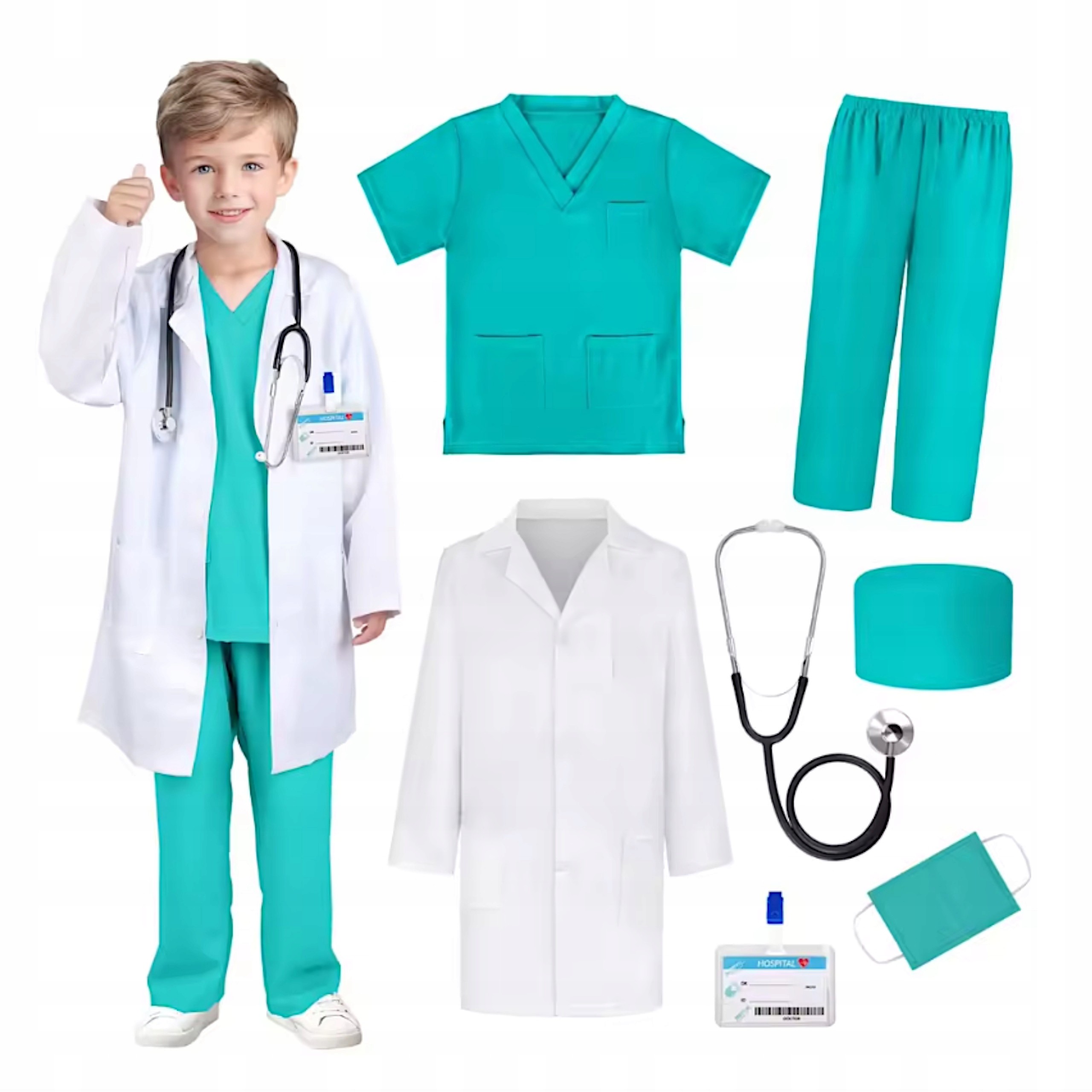 Zestaw kostiumowy dla pediatry to strój lekarza, w komplecie z czapką, płaszczem, koszulką, spodniami, maską i lekkim stetoskopem. Kostium pozwala bawić się w lekarza, rozwija kreatywność i empatię, a jednocześnie jest lekki i wygodny. Idealny do zabawy w domu, przedszkolu lub na przyjęciach tematycznych.