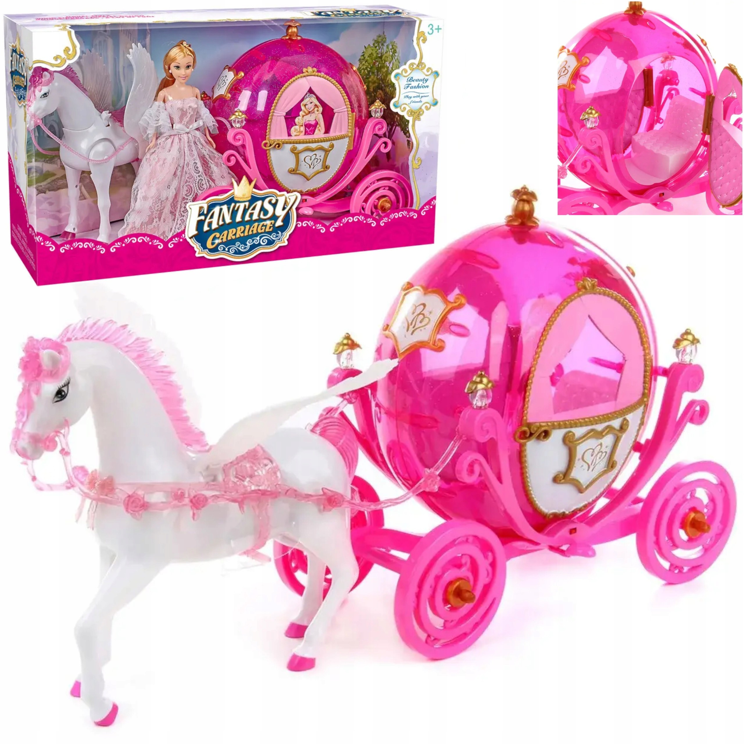 Zabierz swoją małą księżniczkę w bajkową podróż z dużą karetką, lalką i chodzącym koniem. Po włączeniu koń porusza głową i ogonem, emituje realistyczne odgłosy kopyt i rżenia, a kareta świeci kolorowymi światłami. Lalka w pięknej sukni może być przewożona w otwierającej się karetce, co rozwija wyobraźnię i zachęca do tworzenia historyjek.