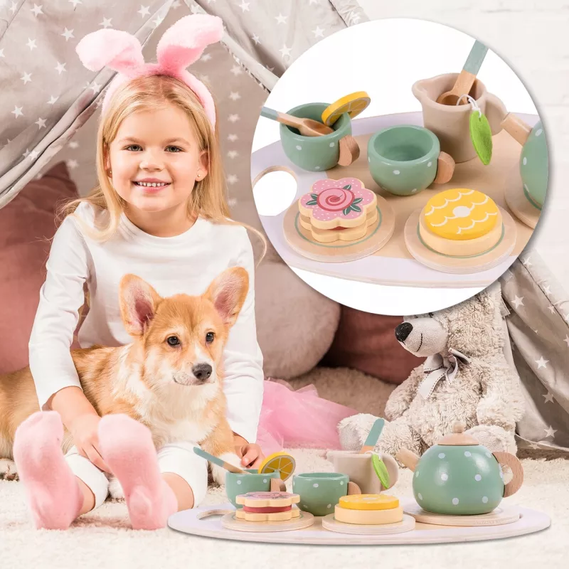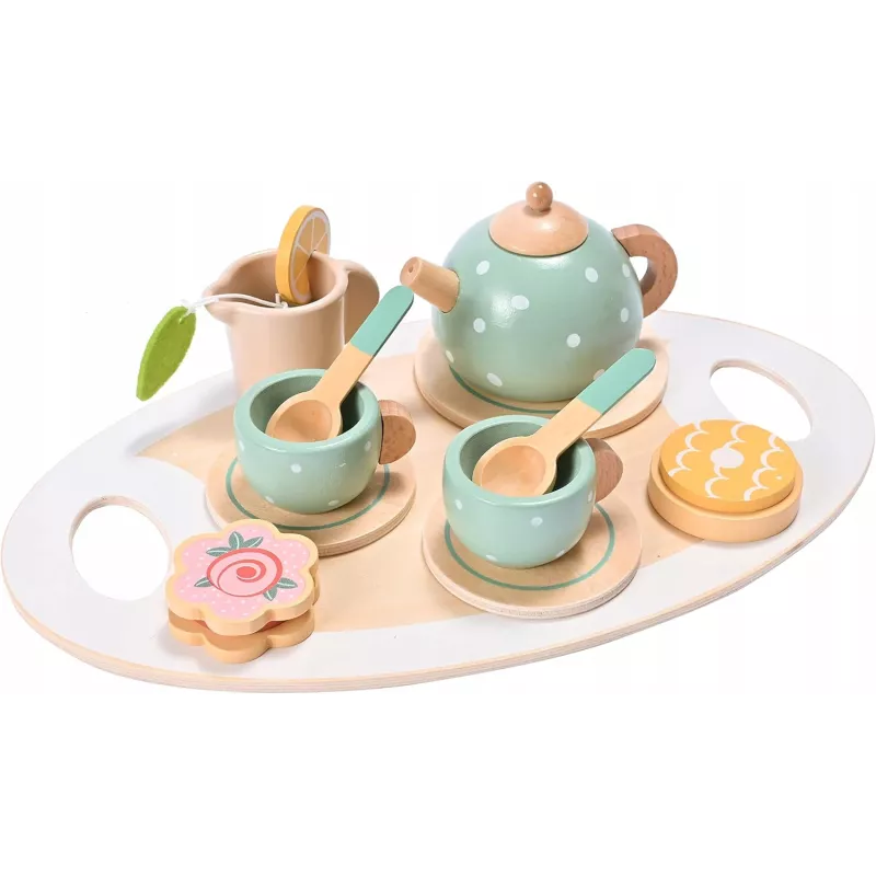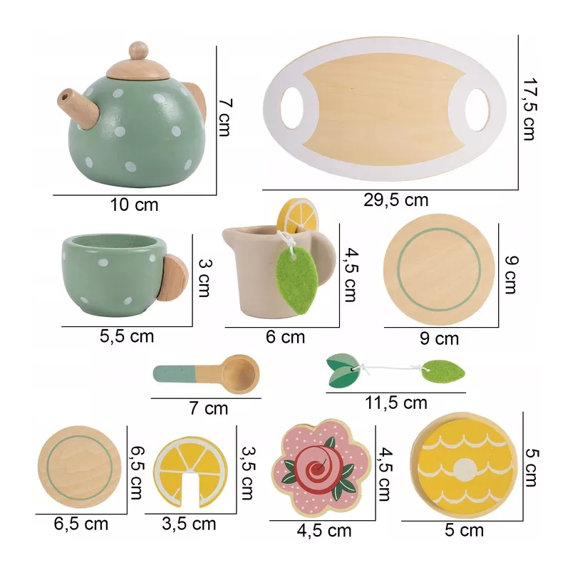 Wszystkie elementy zestawu wykonano z drewna wysokiej jakości – są przyjemne w dotyku, stabilne i odporne na uszkodzenia. Dzięki temu serwis świetnie sprawdza się w codziennej zabawie, a także jako piękny element dekoracyjny w dziecięcej kuchni lub pokoju.
