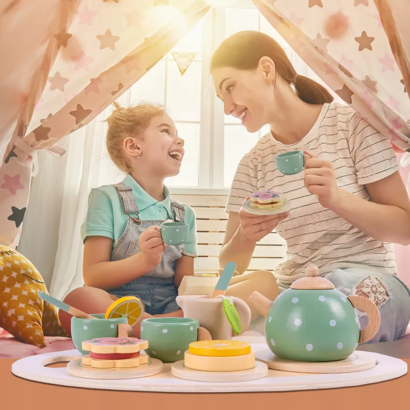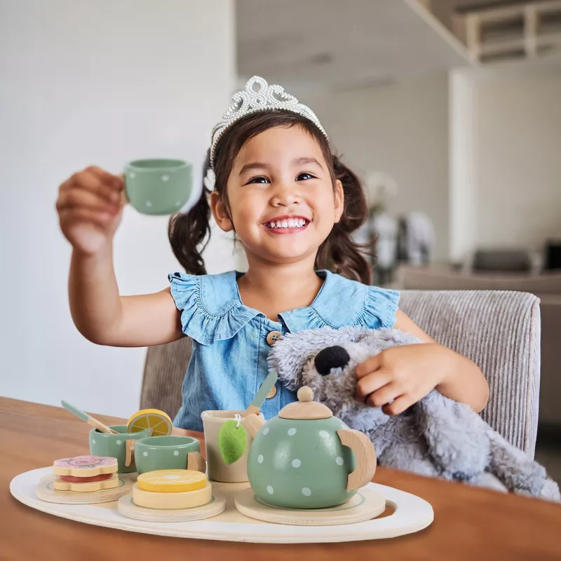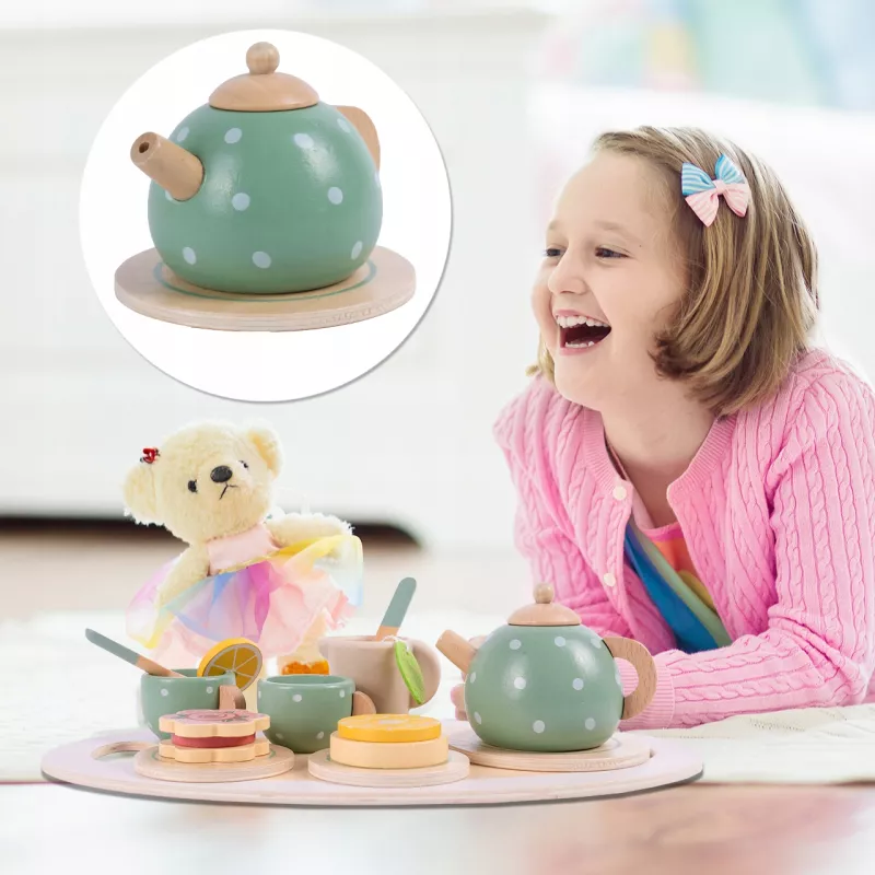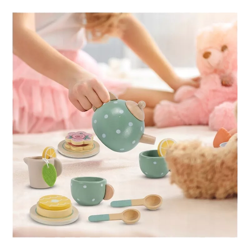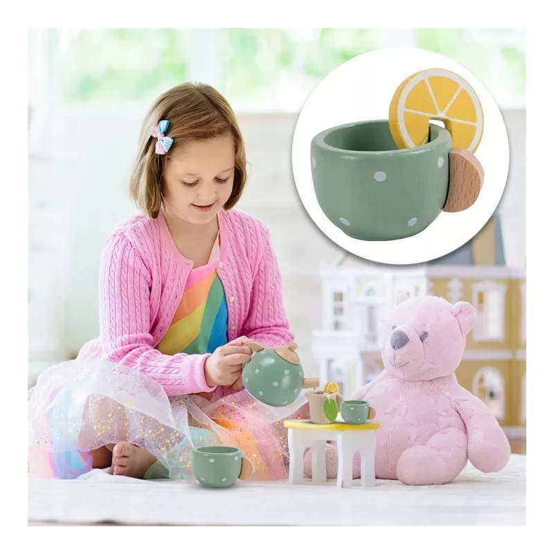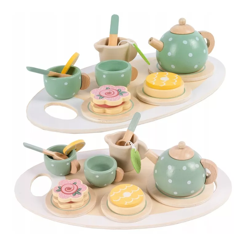 Drewniany zestaw do herbatki dla dzieci to urocza zabawka edukacyjna, która pozwala maluchom naśladować dorosłych i organizować własne przyjęcia. Dziecko może przygotować herbatę, ułożyć filiżanki na tacce, poczęstować misie lub lalki – a przy okazji uczy się zwrotów grzecznościowych jak „proszę”, „dziękuję” i „smacznego”.