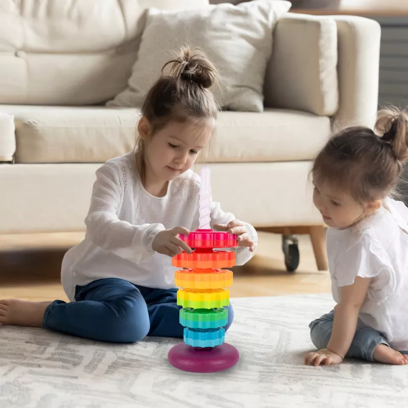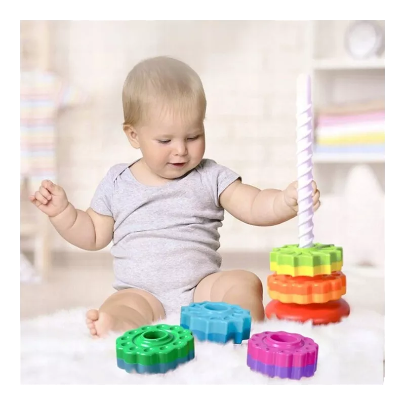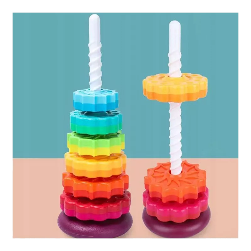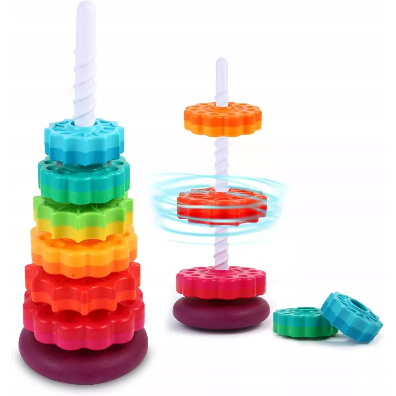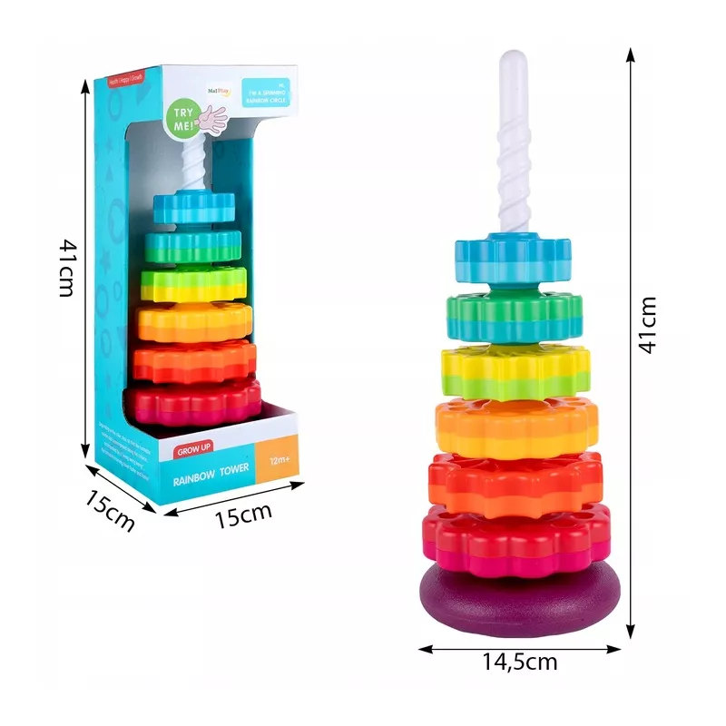 6 tęczowych krążków, spiralny słupek i nieskończona ilość sposobów na zabawę, naukę i rozwój od pierwszego roku życia.