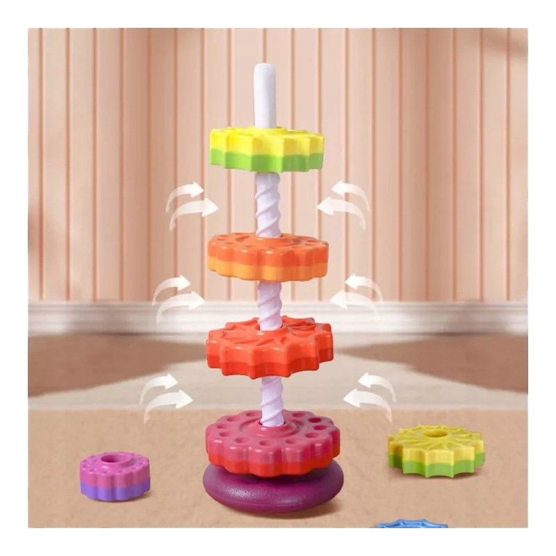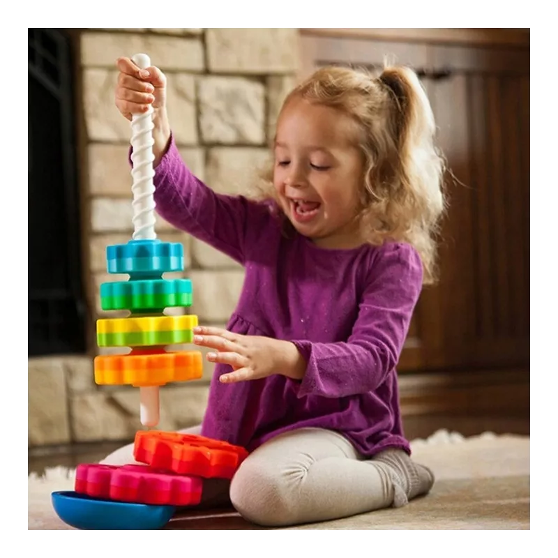 Zakręcona Piramidka Sensoryczna to bezpieczna, kolorowa i angażująca zabawka edukacyjna składająca się z 6 krążków, które maluch nakłada na spiralny słupek. Każdy dysk kręci się w dół jak śruba, tworząc efekt pełen ruchu, bodźców i radości. To układanka, która rozwija dziecko na wielu poziomach – od koordynacji i motoryki, po zmysły, logikę i kreatywne myślenie.