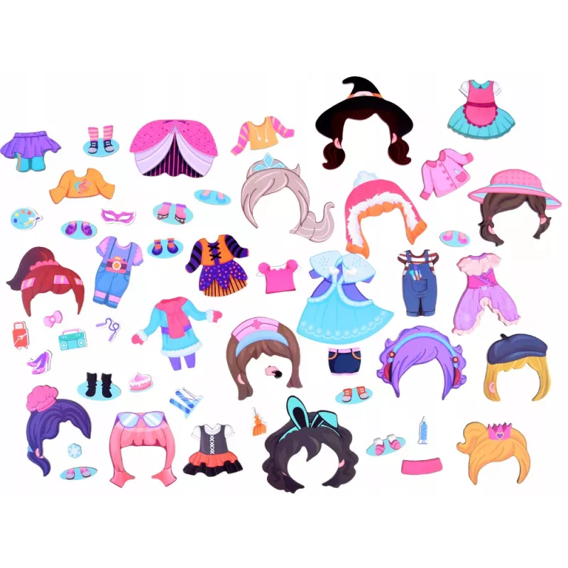 Zestaw łączy zabawę, edukację i rozwój wyobraźni. Dziecko dobiera ubrania, fryzury i dodatki, tworząc stylizacje księżniczki, sportsmenki, malarki czy czarodziejki.