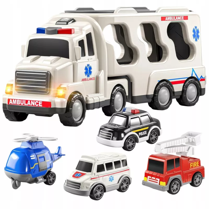 Zestaw laweta i 4 pojazdy ratunkowe – z dźwiękami, światłami i napędem pull-back