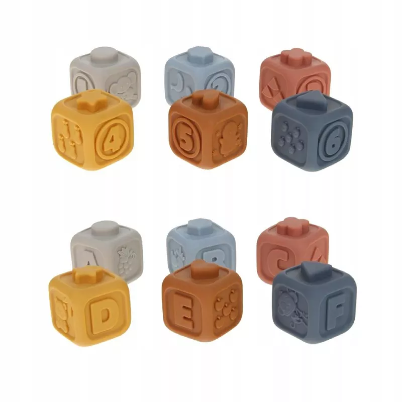 Każdy element ma unikalny wzór i fakturę – owoce, zwierzątka, cyfry i litery – dzięki czemu dziecko ćwiczy zmysł dotyku, wzroku i słuchu. Idealne do zabawy w domu, w kąpieli lub w podróży .