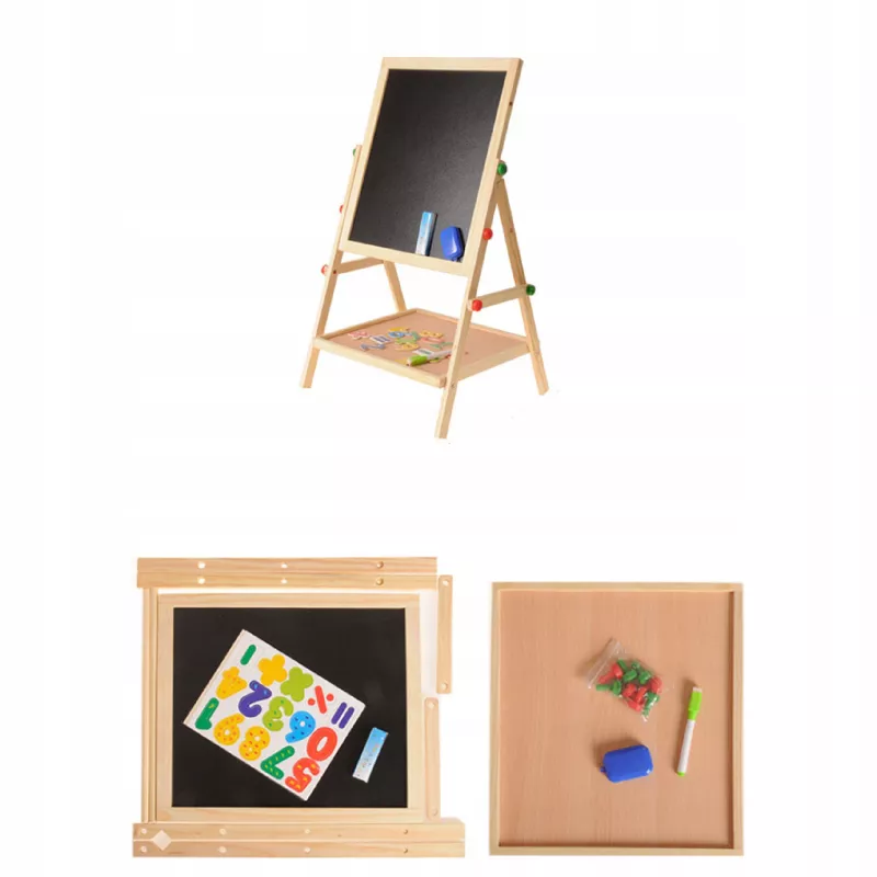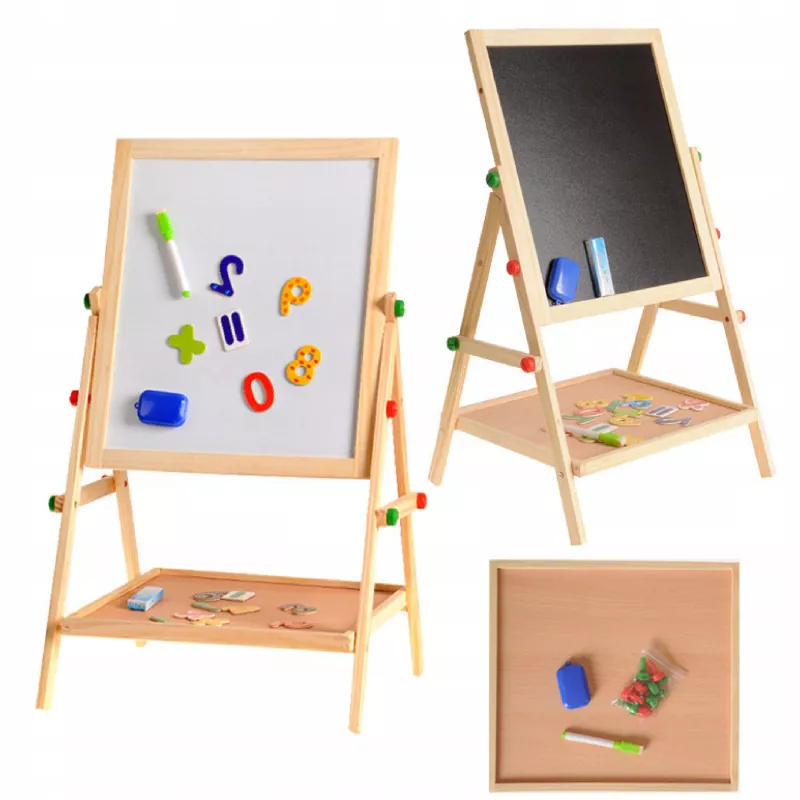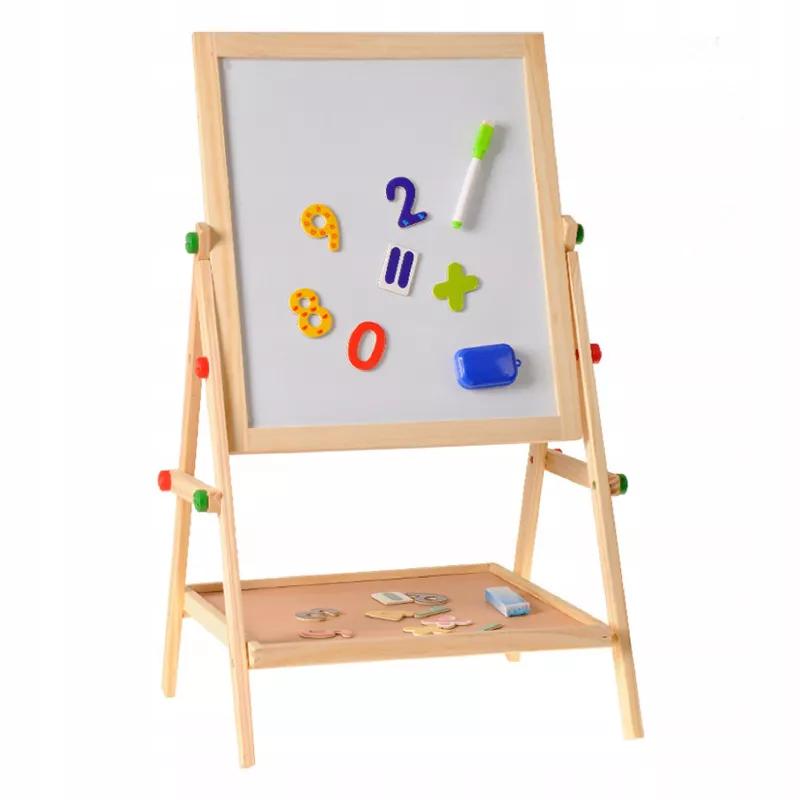 Podaruj dziecku przestrzeń do kreatywnej zabawy i nauki poprzez malowanie dzięki dwustronnej drewnianej tablicy 2w1. Ta tablica stojąca jest wykonana z wysokiej jakości drewna sosnowego, co gwarantuje stabilność i trwałość przez długie lata. Idealna dla dzieci od 3. roku życia, umożliwia rysowanie, malowanie i odkrywanie różnych technik artystycznych w domu i w przedszkolu.