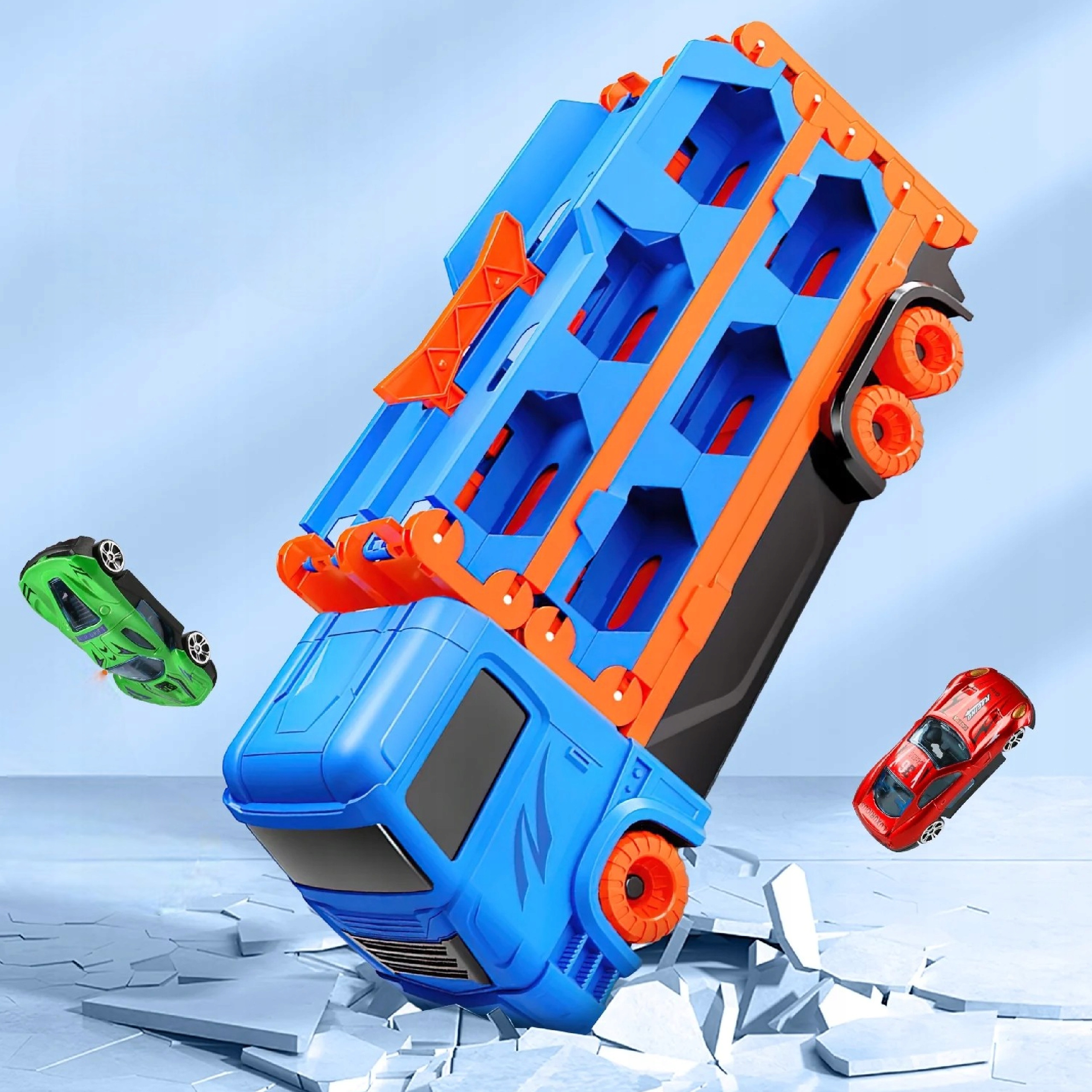 Po rozłożeniu kontenera ciężarówka zamienia się w superdługi tor wyścigowy o długości aż 165 cm, który pozwala dzieciom urządzać emocjonujące wyścigi bez użycia baterii.