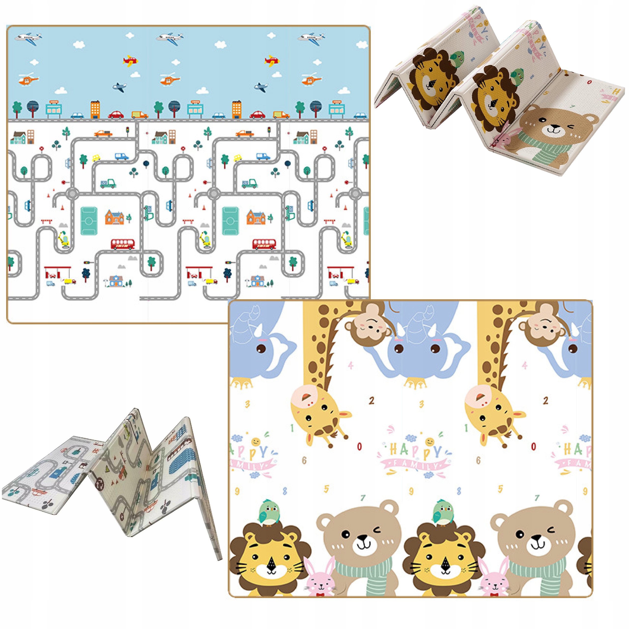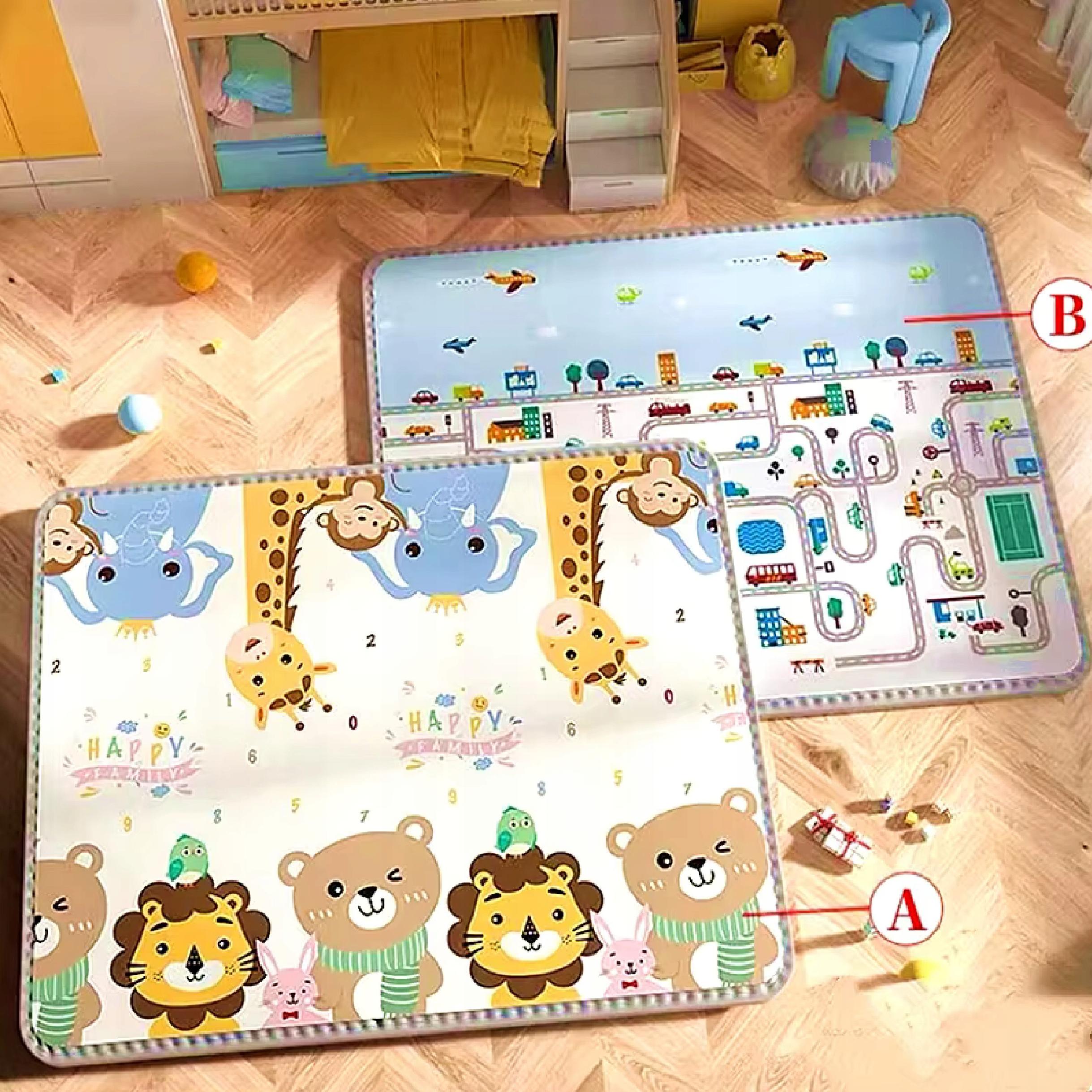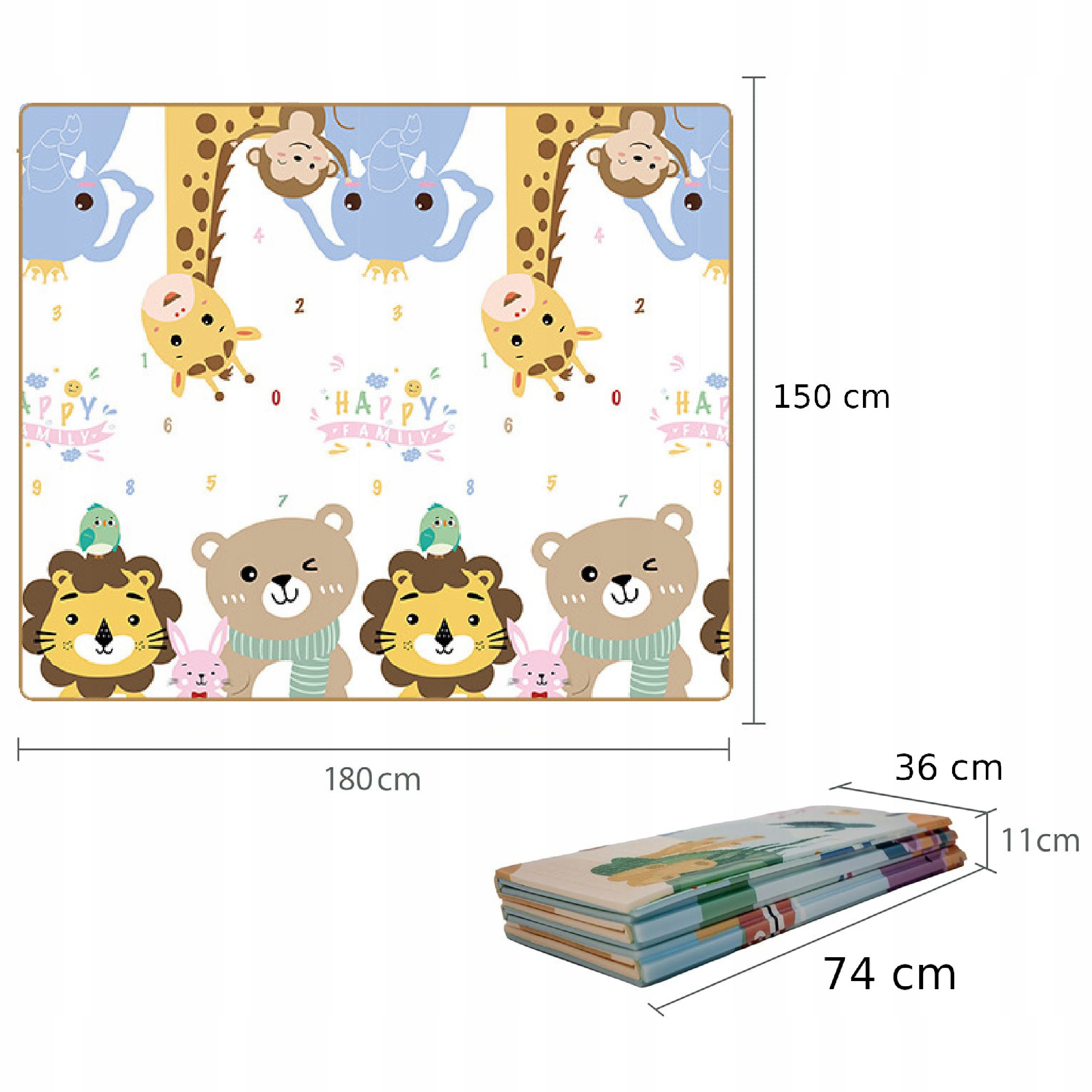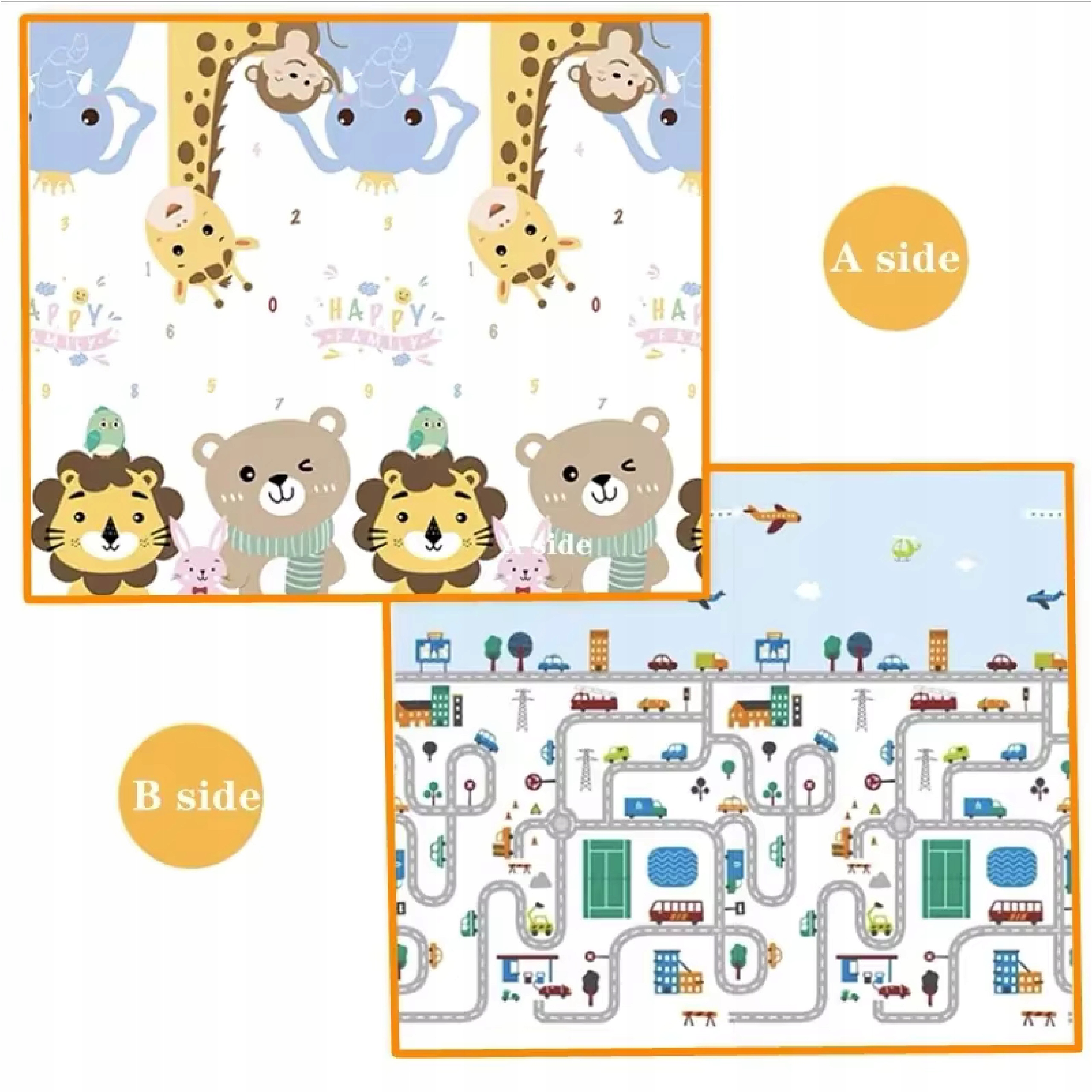 Dwustronny design z różnymi wzorami pobudza ciekawość dziecka i urozmaica codzienną zabawę. Jedna mata – dwa style użytkowania. W zestawie znajduje się praktyczny pokrowiec, ułatwiający przechowywanie i transport.