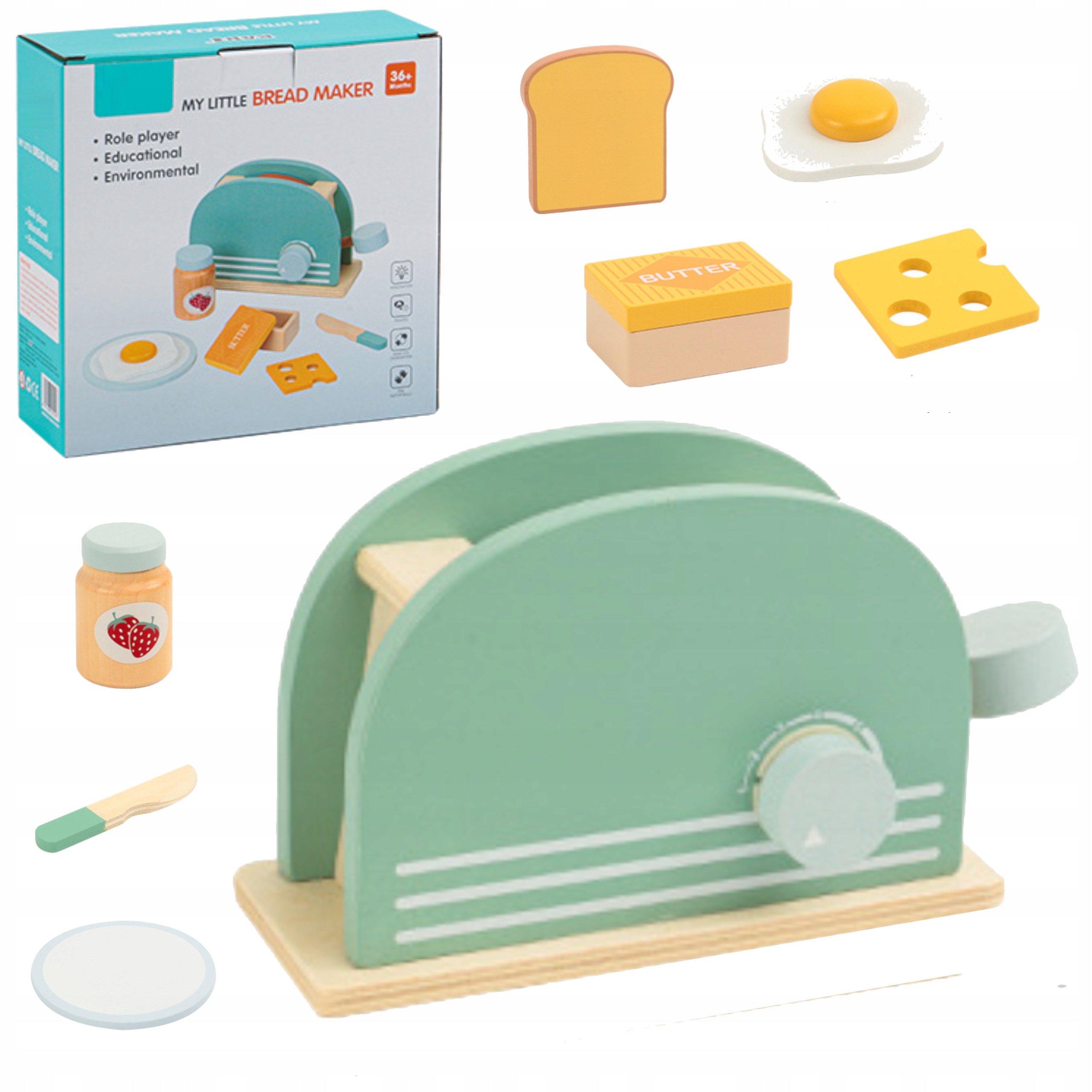Edukacyjny zestaw drewniany „Śniadanie z Tosterem” to kreatywna zabawka dla dzieci od 3 roku życia, która umożliwia odgrywanie ról i naśladowanie codziennych czynności dorosłych.