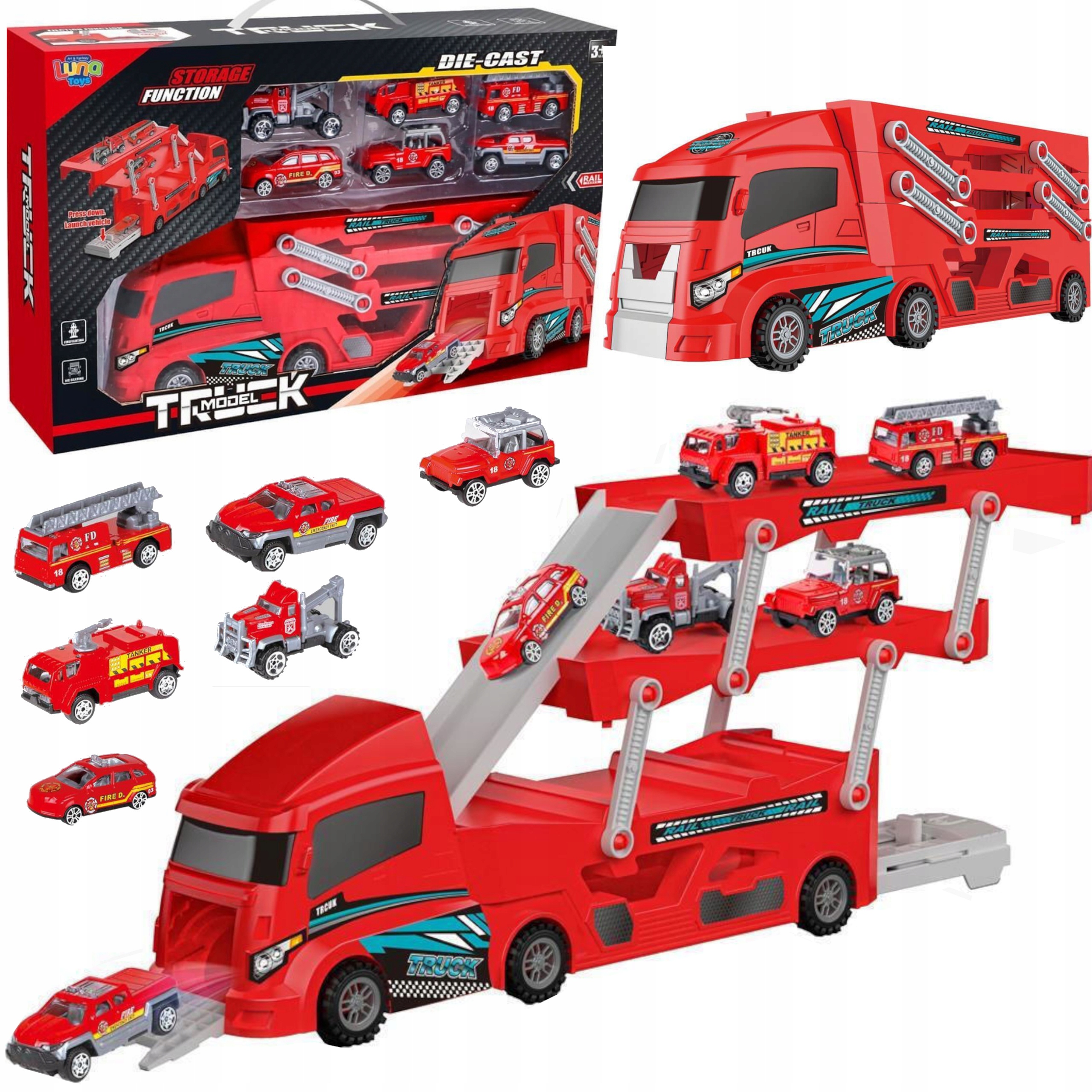 Duża laweta transporter z zestawem metalowych autek straży pożarnej to rozbudowany zestaw dla dzieci, które uwielbiają pojazdy ratunkowe i dynamiczną zabawę. Funkcja rozkładanej platformy oraz możliwość przechowywania samochodzików w naczepie sprawiają, że zabawka łączy funkcję transportera i mobilnego garażu.