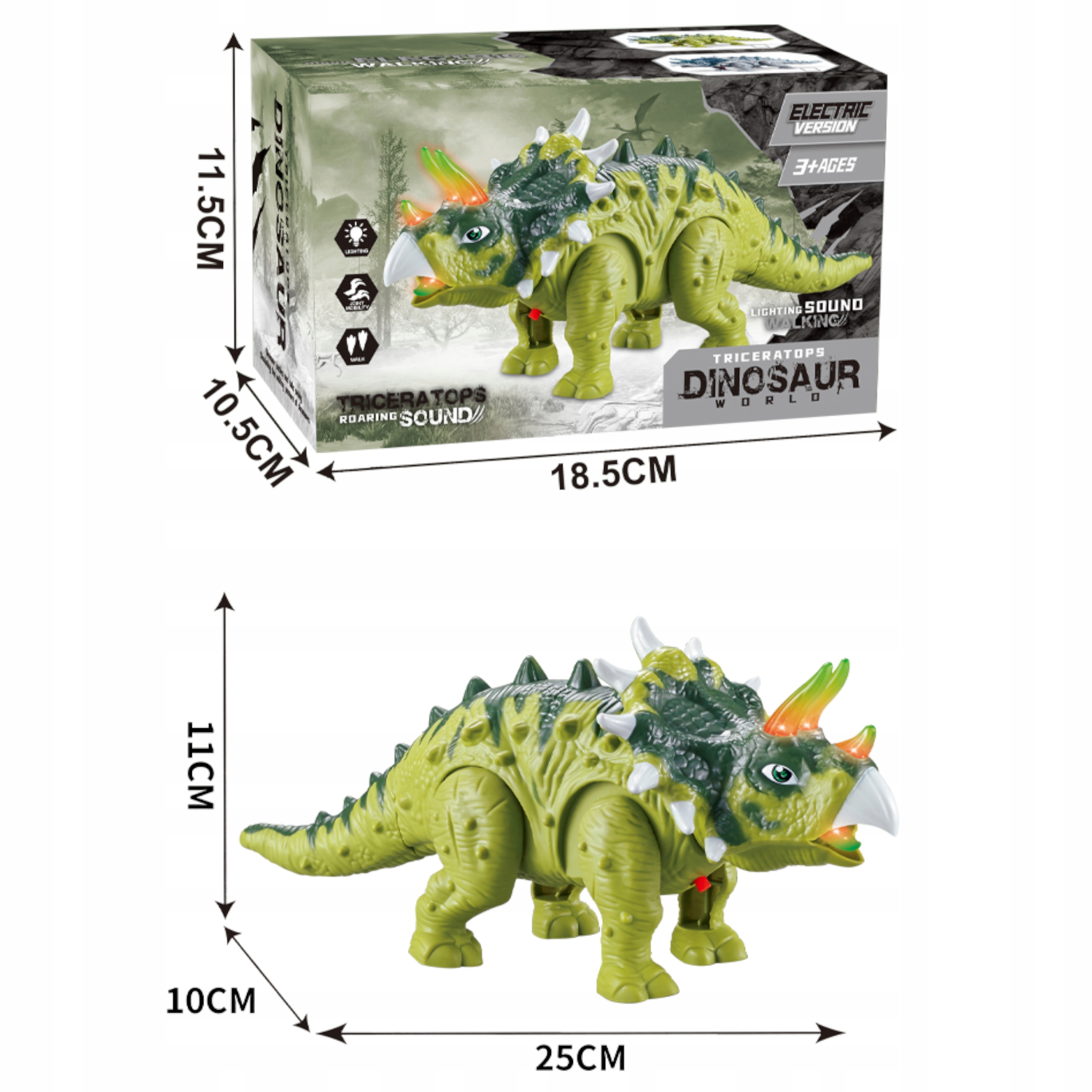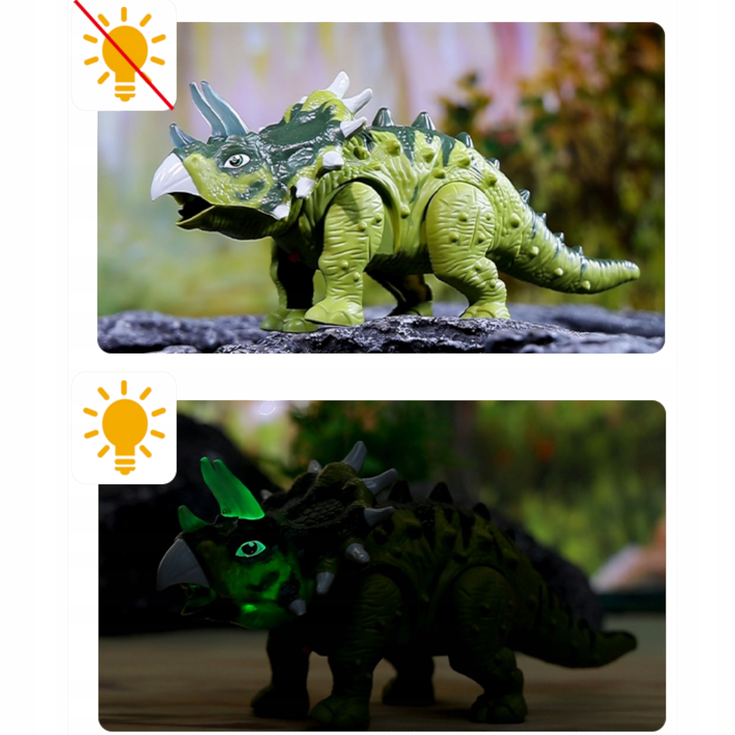 Dinozaur posiada charakterystyczne rogi oraz detale odwzorowujące prehistoryczne stworzenie. Zielone, podświetlane elementy LED nadają mu wyjątkowy, atrakcyjny wygląd, który przyciąga uwagę dziecka już od pierwszego uruchomienia.