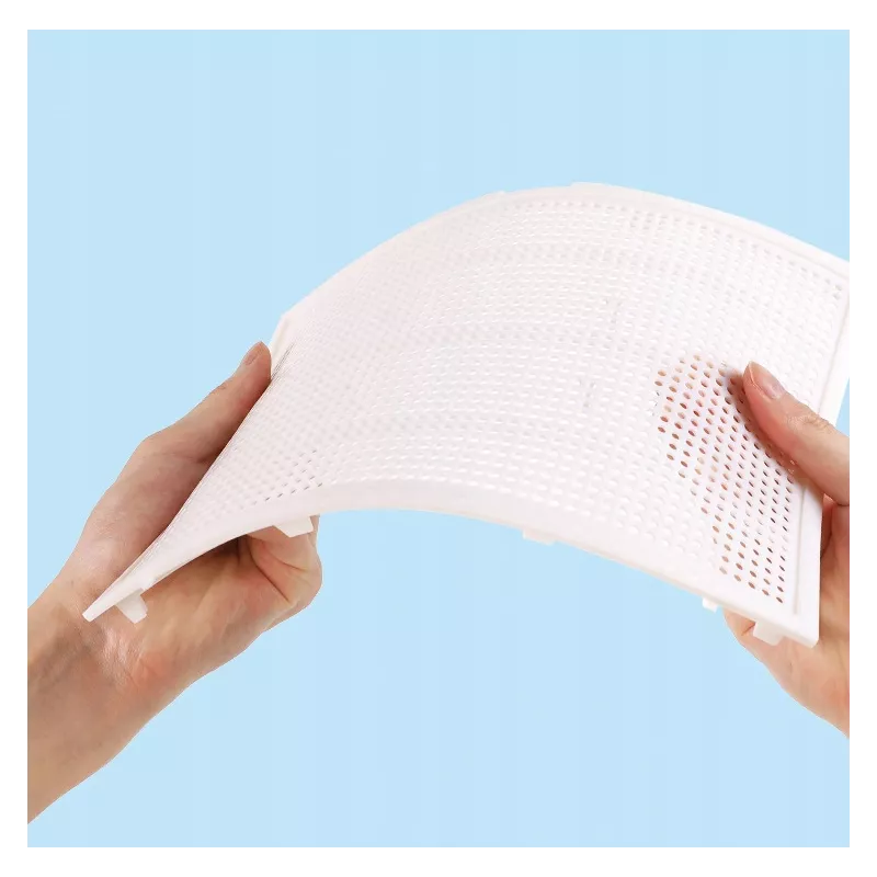 Walizka pełni podwójną funkcję: jest jednocześnie perforowaną planszą do układania wzorów oraz praktycznym pojemnikiem do przechowywania wszystkich pinezek, co ułatwia utrzymanie porządku.