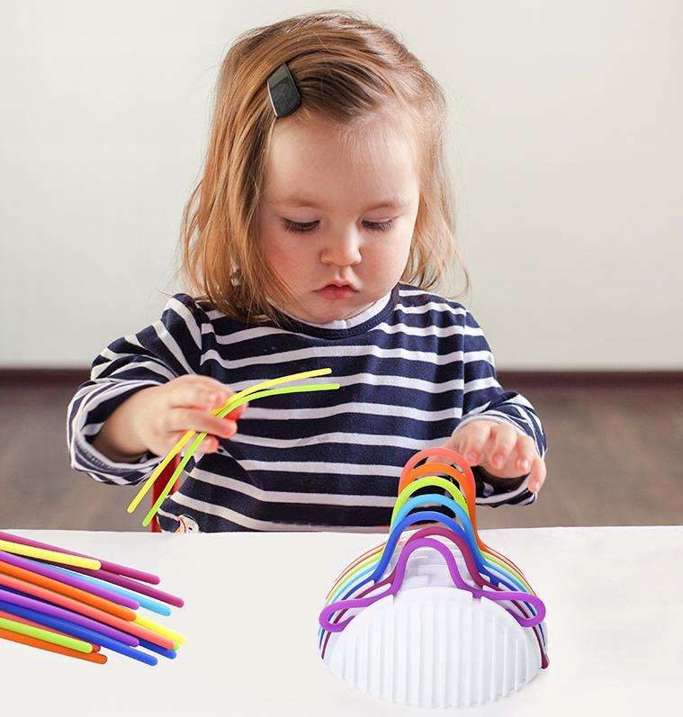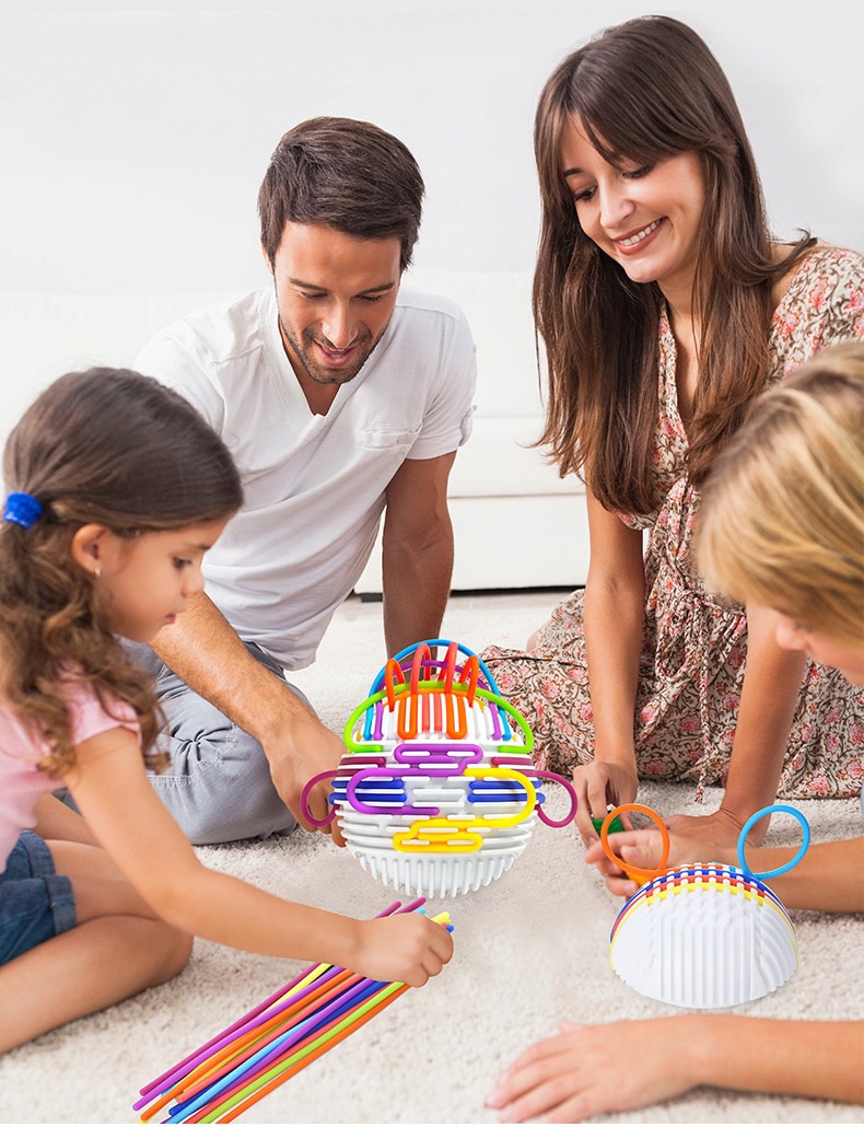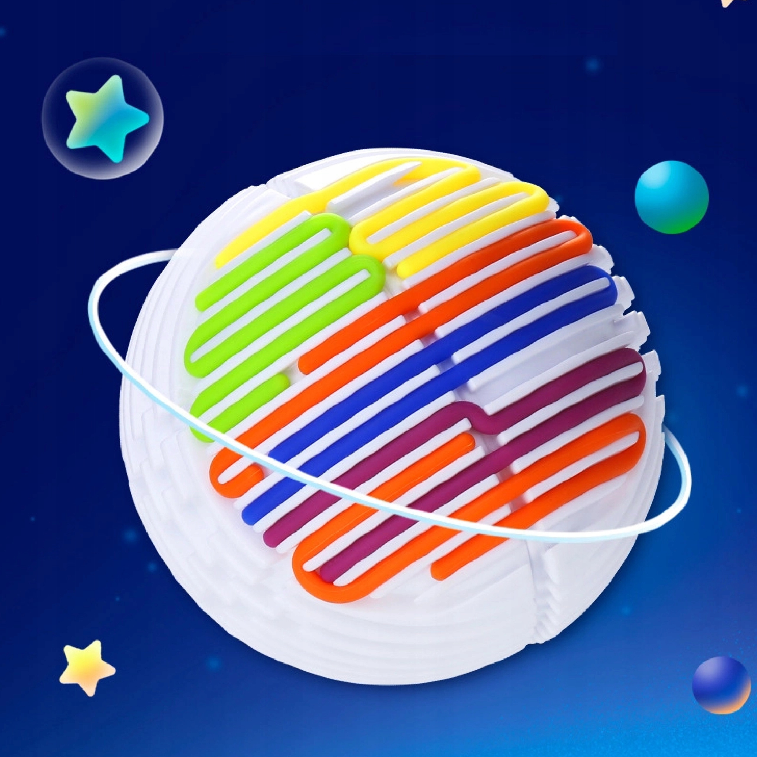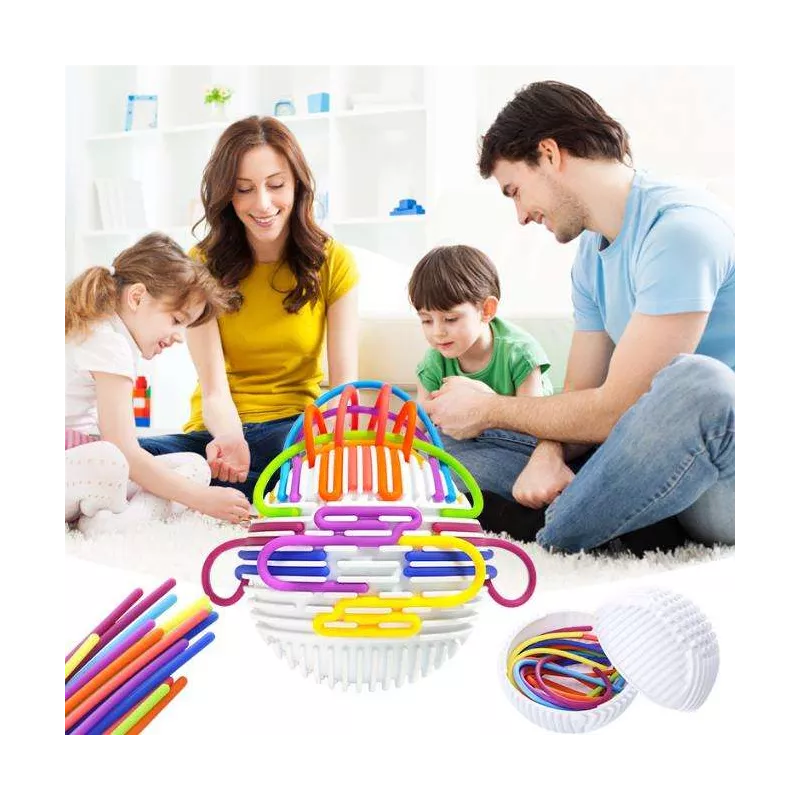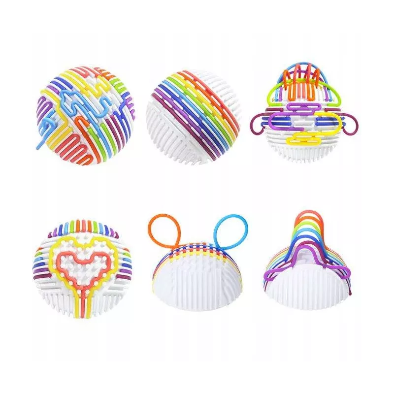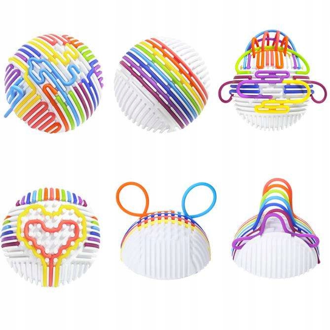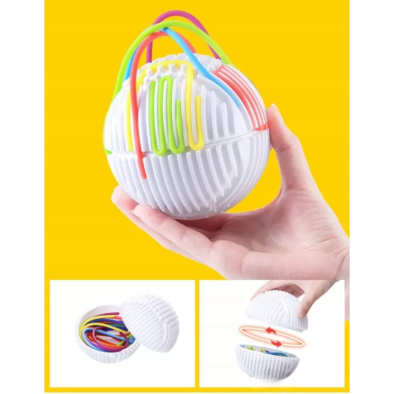 Zabawa polega na przeciąganiu elastycznych, kolorowych linek przez otwory (tunele) w kuli. Dziecko może tworzyć dowolne wzory, ćwicząc przy tym precyzję i planowanie.