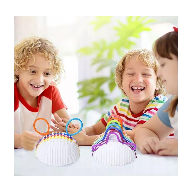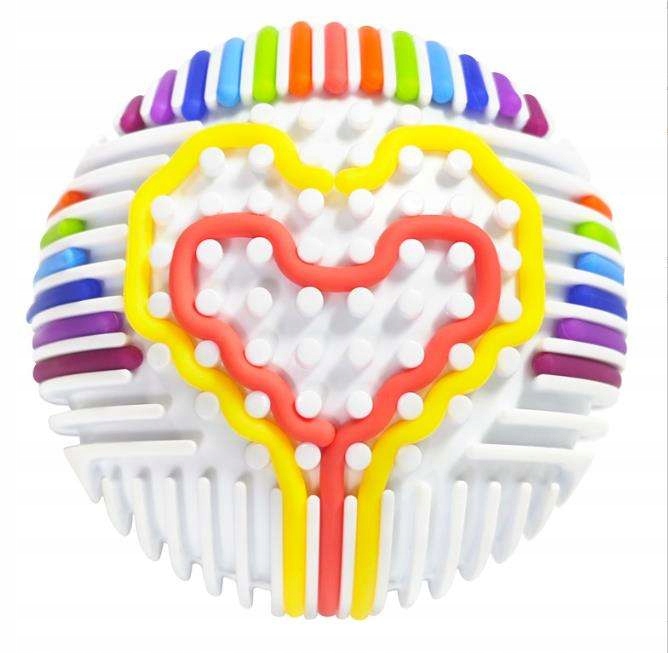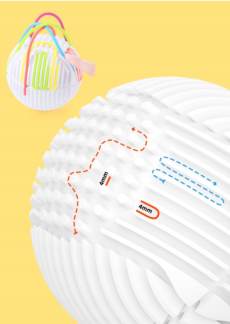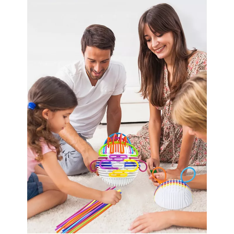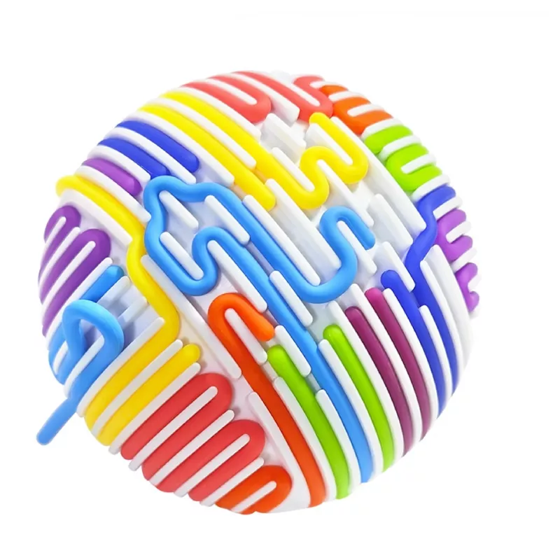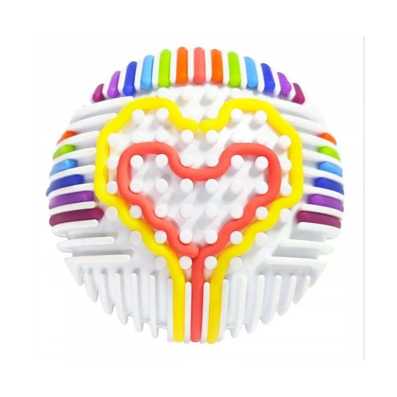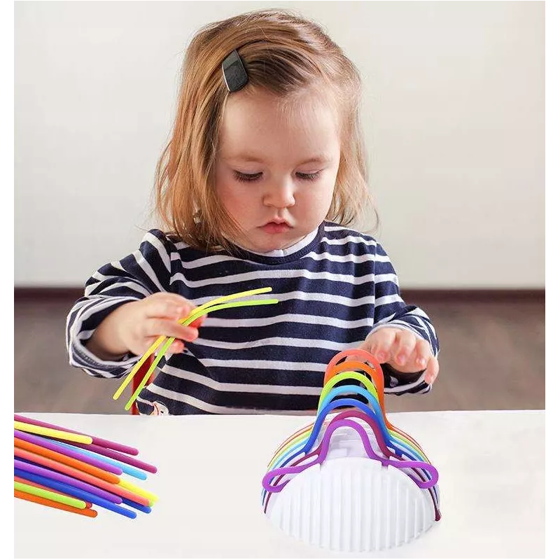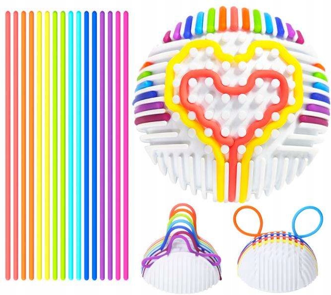 Zabawa polega na przeciąganiu elastycznych, kolorowych linek przez otwory (tunele) w kuli. Dziecko może tworzyć dowolne wzory, ćwicząc przy tym precyzję i planowanie.