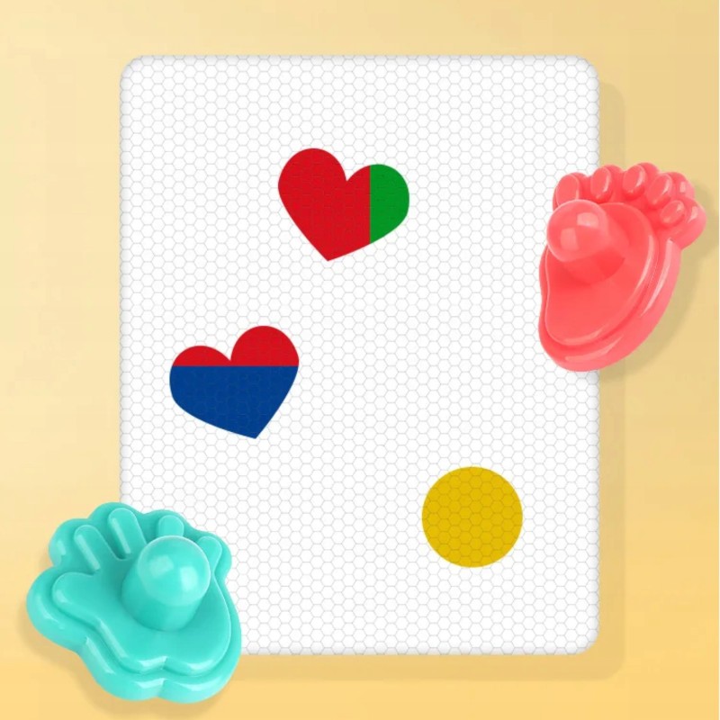 • W zestawie znajdują się dwie pieczątki w kształcie ręki i stopy, które urozmaicą zabawę oraz rysunki