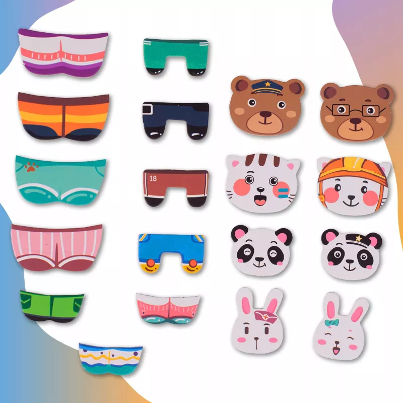 W zestawie znajduje się wszystko, czego potrzeba do tworzenia kolorowych historii, zabawnych scenek i spersonalizowanych kompozycji. Dziecko może dopasowywać ubranka, łączyć elementy z różnych kart oraz rysować własne dodatki, dzięki czemu zabawa rozwija wyobraźnię i ekspresję twórczą.