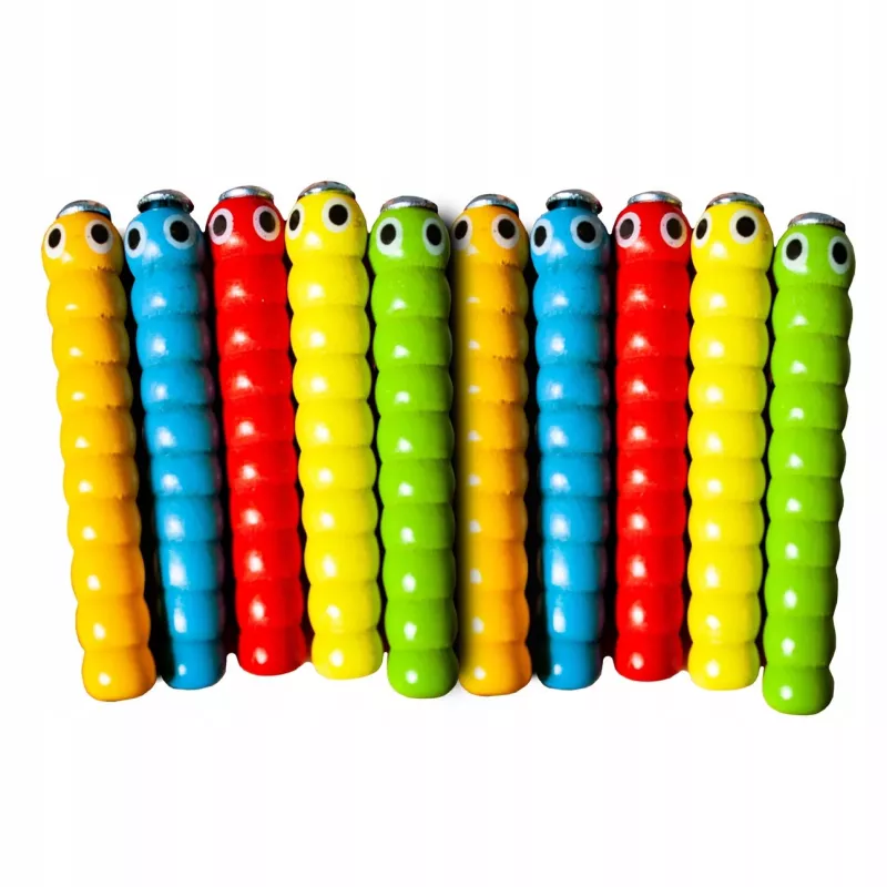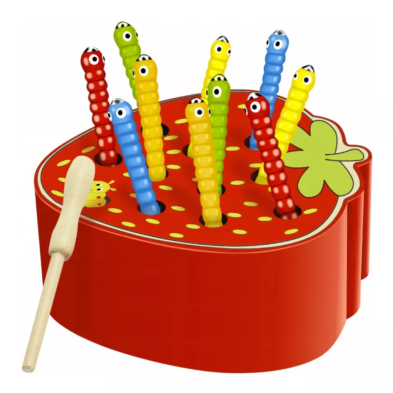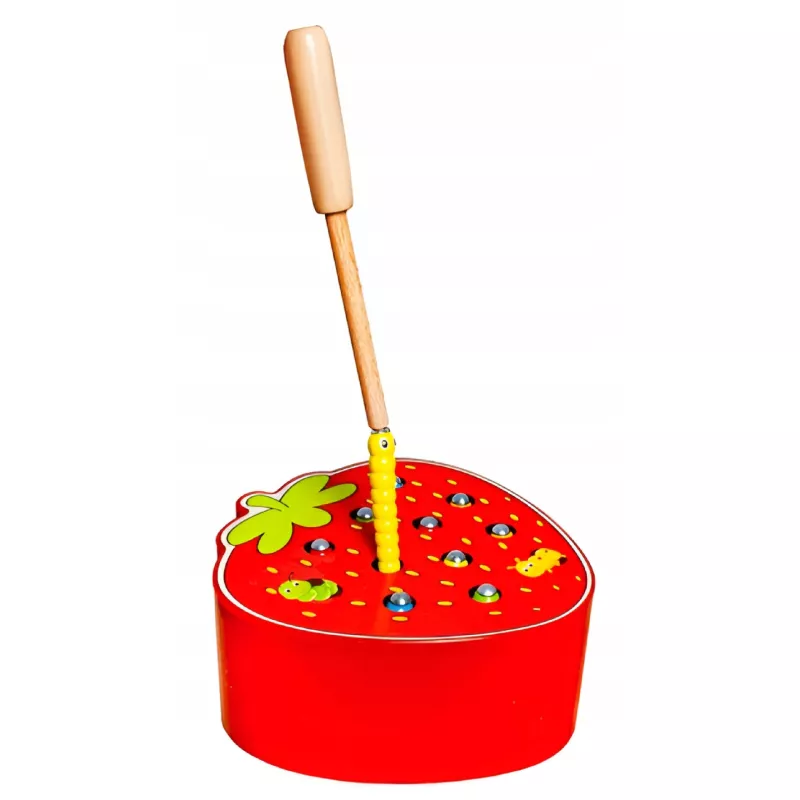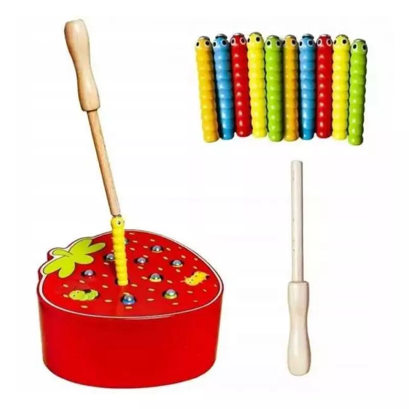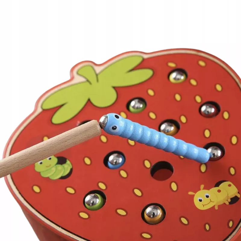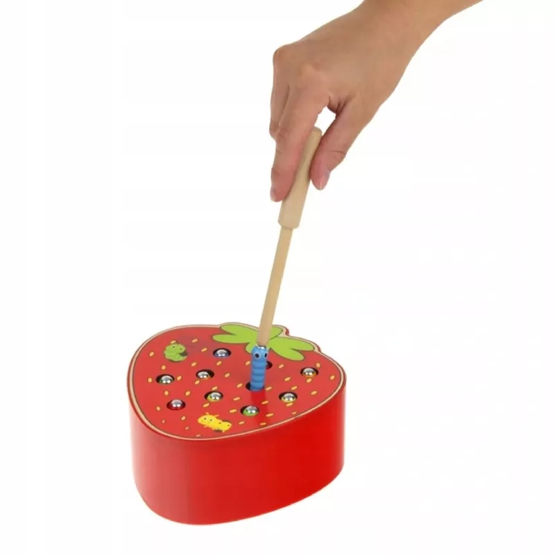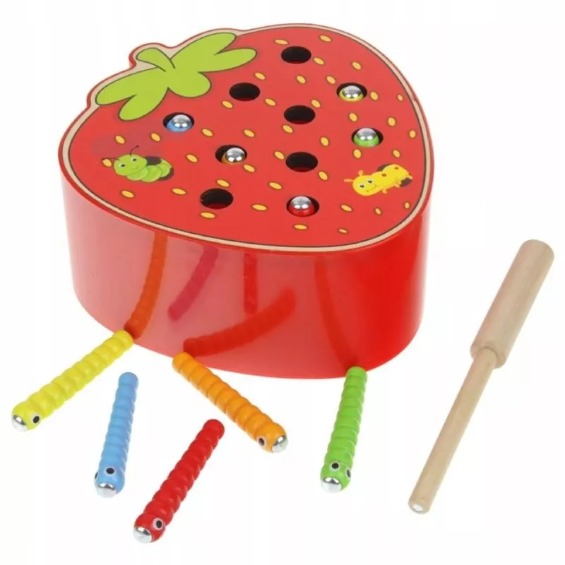 - 📦 Zawartość zestawu: drewniana truskawka, kijek z magnesem, 10 robaczków/gąsienic